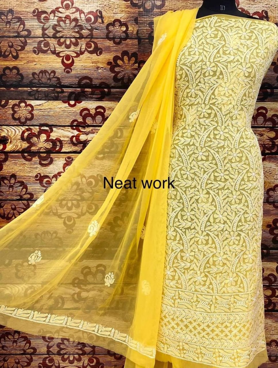 Hand wash separately with mild detergent to preserve the delicate chikankari embroidery.