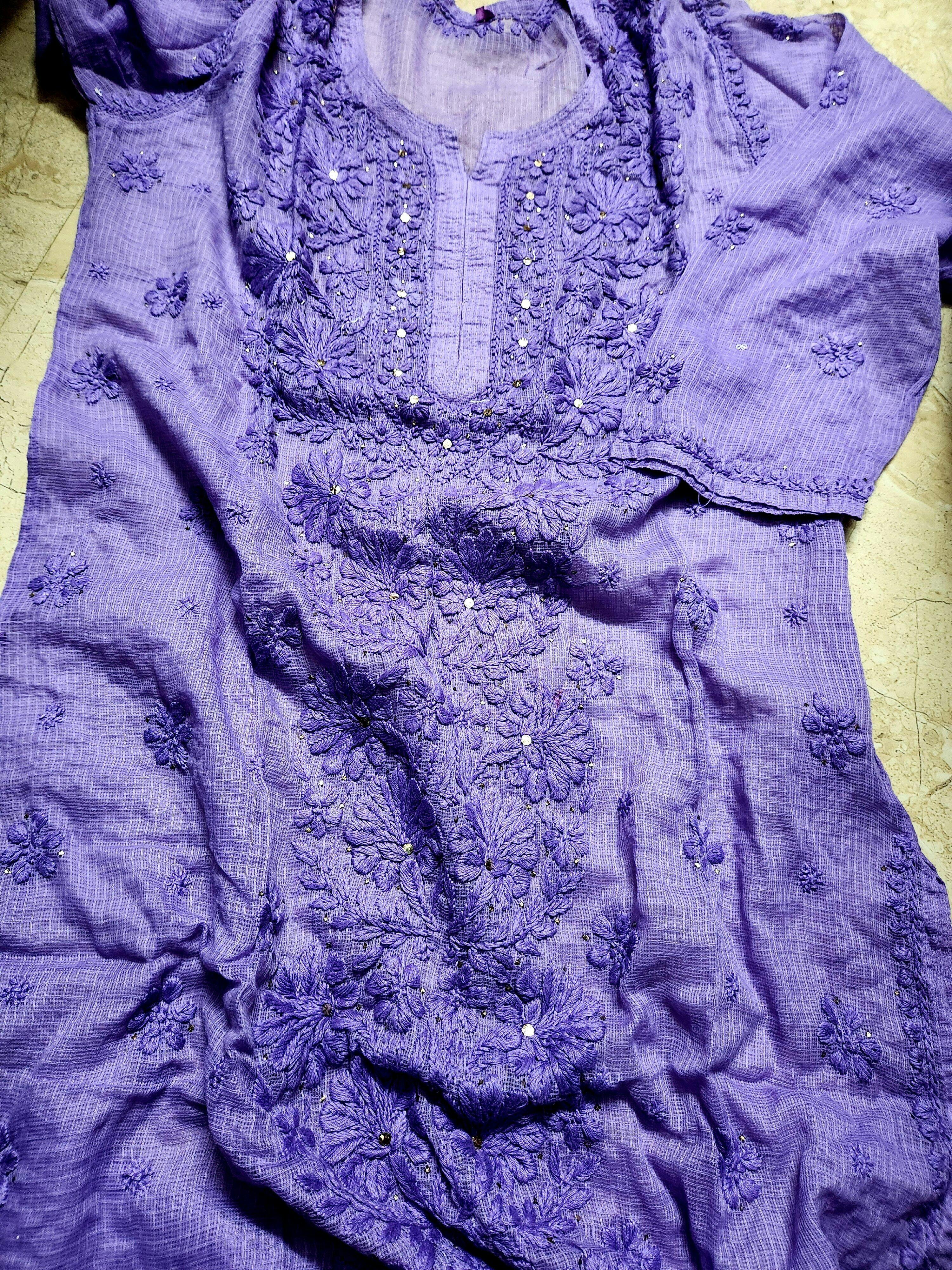 Hand wash separately with mild detergent to preserve the delicate chikankari embroidery.